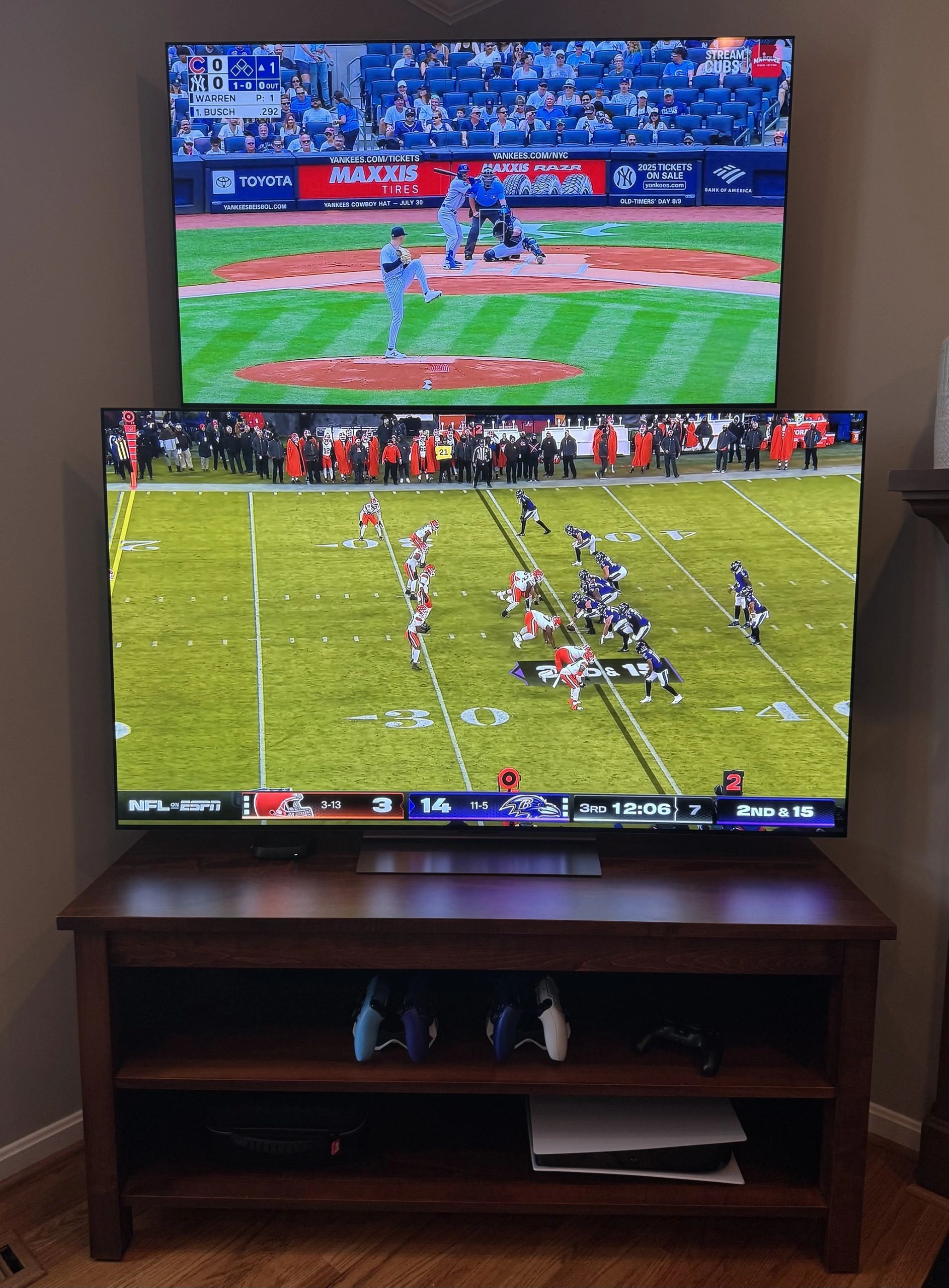 Crafted with sturdy materials to ensure stability, this stand accommodates various TV sizes and styles. Cable management systems keep wires organized and out of sight, delivering a clean, clutter-free look. Whether you're watching two games simultaneously or pairing gaming with entertainment, this Double TV Stand brings convenience and style to any room.